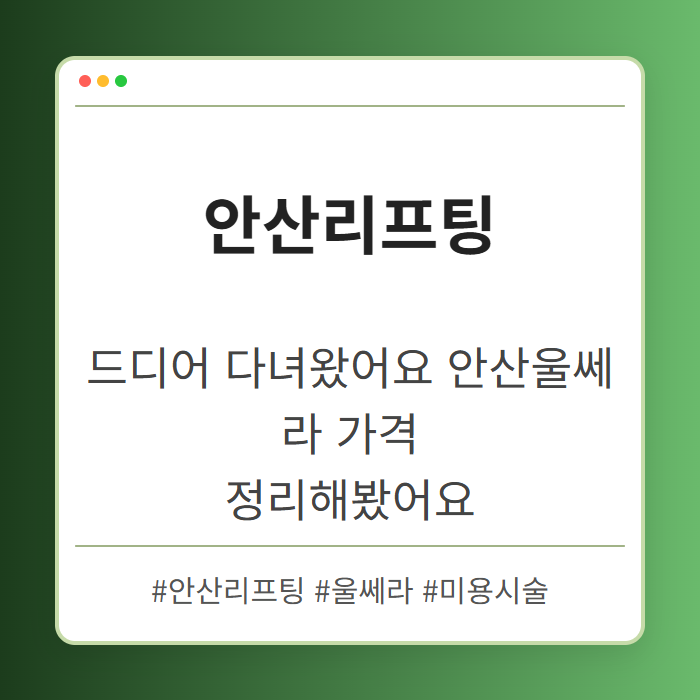 안산에서 울쎄라 시술을 경험한 후, 가격, 효과, 예약 방법 등을 완벽히 정리했습니다. 이 글에서는 안산리프팅에 대한 모든 정보를 제공하고 있습니다. 안산울쎄라 경험기 및 가격 분석 최근 **안산에서 울쎄라**를 직접 경험하였습니다. 이 시술은 피부의 탄력을 회복하고 주름 개선에 도움을 주는 시술로, 많은 사람들 사이에서 인기를 끌고 있습니다 …