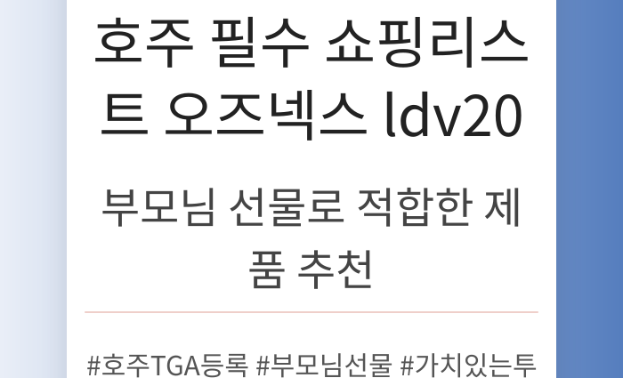 LDV20을 부모님께 드린 것이 정말 행복해요. 이제는 가족 모두가 함께 챙길 수 있는 제품이 되어버렸죠. 부모님께서도 주변 지인들에게 추천하시면서 자연스럽게 입소문이 나더라구요. 이처럼 LDV20은 호주 여행에서 꼭 사야 할 필수 쇼핑리스트 제품으로 자리 잡게 되었어요!
